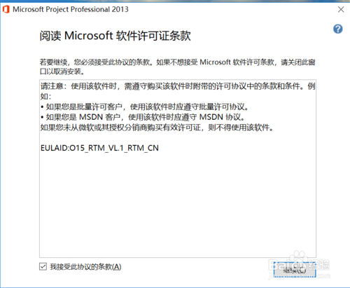 阅读软件许可证许可,勾选“我接受此协议的条款”,然后点击“继续”,如下图所示:
