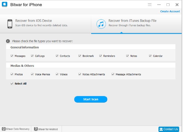 Bitwar iPhone Data Recovery是为广大iphone用户打造的专业数据恢复软件。软件界面非常清爽,功能强大易用,无论是联系人、电话号码、视频、照片、浏览器书签等,它都可以为你轻松找回这些丢失的数据。软件支持多种IOS设备和系统版本,非常的方便。