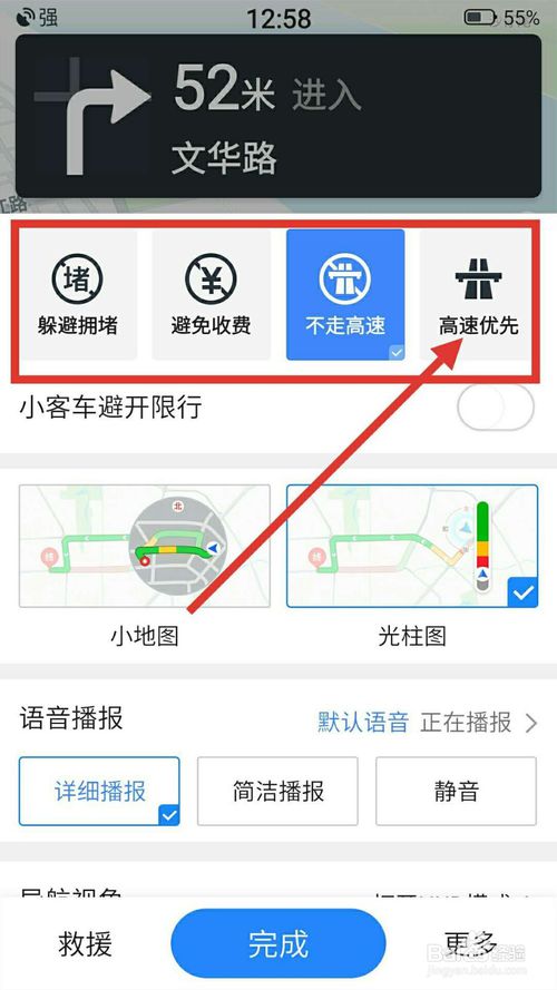 6、然后对线路进行设置,如果是跨城的距离,就要点击“高速优先”“避免拥堵”了,如下图所示: