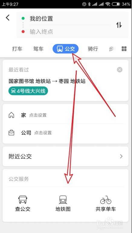 2、在打开的高德地图的路线页面中,点击上面的“公交”选项卡,然后下面可以看到一个“地铁图”的图标。