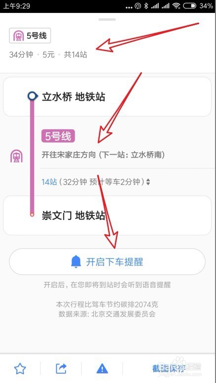 8、这时就会显示出当前选择起点与终点的路线图,显示出一共多少站,乘车时间等,另外还可以设置“开启下车提醒”,在我们要下车的终点给出提示。