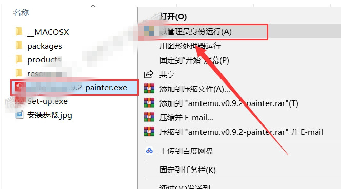 17.打开之前解压后的【PS2017 X64bit】文件夹,选中【amtemu.v0.9.2-painter】可执行文件,鼠标右击选择【以管理员身份运行】。