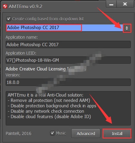 18.点击下拉菜单选择【Adobe Photoshop CC 2017】然后点击【Install】。