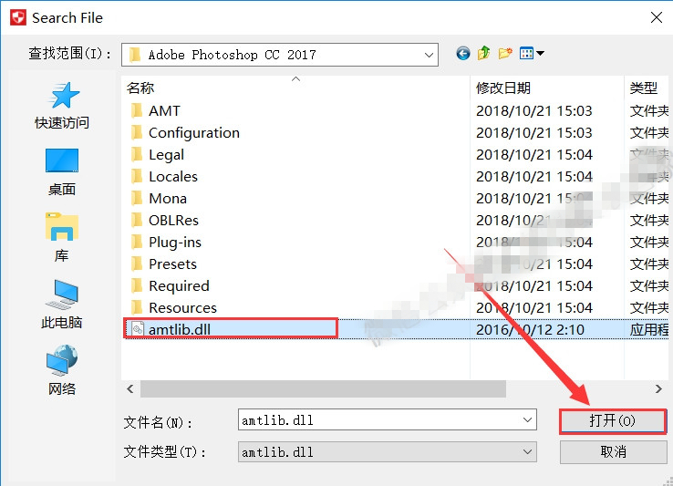 19.查找范围就去之前粘贴的位置找【Adobe Photoshop CC 2017】,选择【amtlib.dll】文件然后点击【打开】。