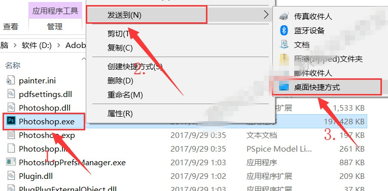 22.选中【Photoshop.exe】文件,鼠标右击依次选择【发送到】、【桌面快捷方式】。