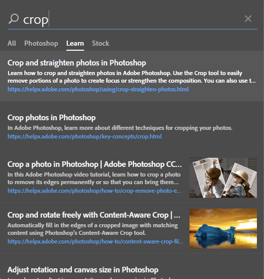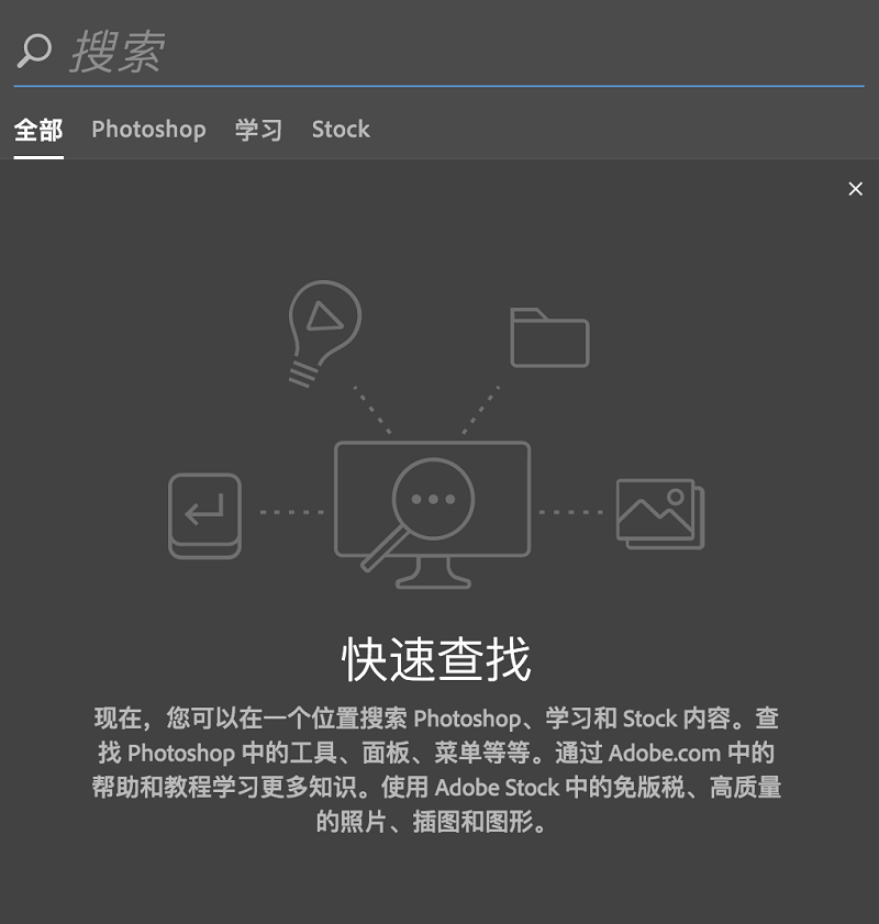 快速搜索可以让我们在 PS 中快速查找工具、面板、菜单、Adobe Stock 资源模板、教程等,工作更加高效快捷。