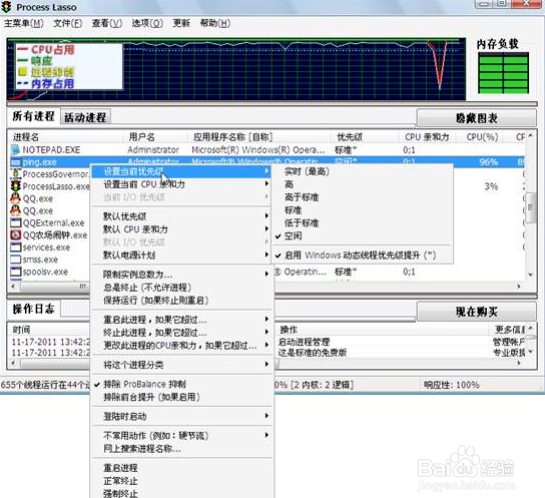 首先从本站下载安装Process Lasso软件,启动该软件后,在该软件主程序界面上看到的当前系统内的进程列表,从中可以看到这个讨厌的“ping.exe”进程仍在疯狂的占用CPU资源,试着使用Process Lasso来处理“ping.exe”进程。
