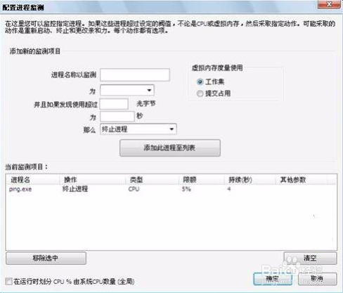 针对电脑中存在的“ping.exe”进程疯狂占用CPU资源的情况,选择使用Process Lasso提供的“终止此进程,如果它超过…”服务,并且自定义将该进程的最大CPU占用量控制在5%,以此约束该进程对系统资源的占用