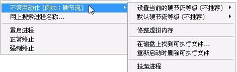 Process Lasso还提供有诸如虚拟内存整理、进程挂起等若干不常用功能,用户可以通过该软件右键菜单“不常用功能”项选择使用这些功能
