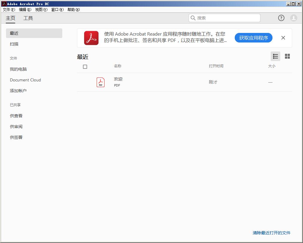 除了显示从您的计算机、Document Cloud 存储空间或第三方存储空间(如 OneDrive、Dropbox、Box、SharePoint 和 Google Drive)打开以进行查看的文件之外,还显示他人与您共享或您与他人共享以进行查看、审阅或签名的文件。
