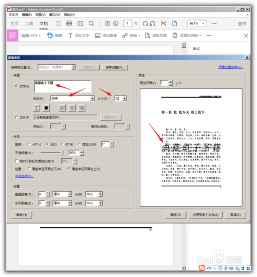 在打开的添加水印窗口中,输入水印文字,选择文字字体,选择文字大小,在右侧预览窗口中可以看到水印的效果。