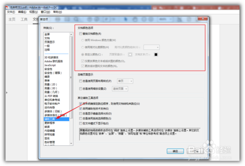 在打开的首选项设置窗口中,点击左侧的辅助工具选项卡,则右侧最上方的区域就是设置文档背景和文字颜色的菜单。