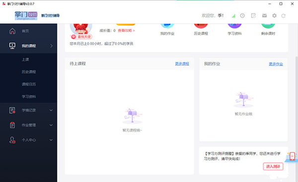 掌门一对一辅导怎么进行学习力测评?从客户端菜单栏选择“学情记录>学习力测评”即可进入该栏目,若之前未进行过测评,则进入该栏目后即直接开始测评,按要求回答完所有题目之后,系统即可自动生成测评报告。