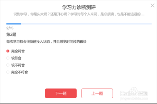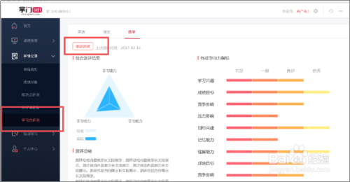 从客户端菜单栏选择“学情记录>学习力测评”即可进入该栏目,若之前未进行过测评,则进入该栏目后即直接开始测评,按要求回答完所有题目之后,系统即可自动生成测评报告。