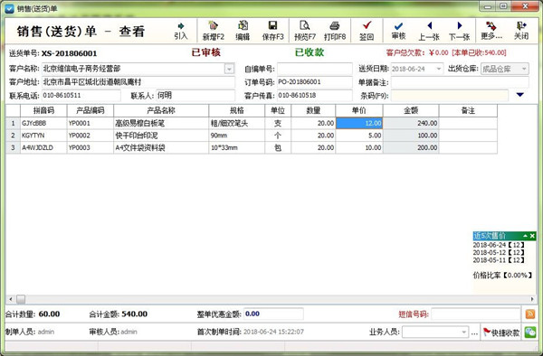 (1) 管理客户报价:可独立使用,自由设计报价单打印格式;也可生成销售订单,实现销售流程跟踪追溯功能。(2) 管理客户订货:可独立使用;也可用作合同管理使用(自定义合同条款,自由设计合同打印格式);可免录入由报价单生成;也可生成销售发货单,实现销售流程跟踪追溯功能。