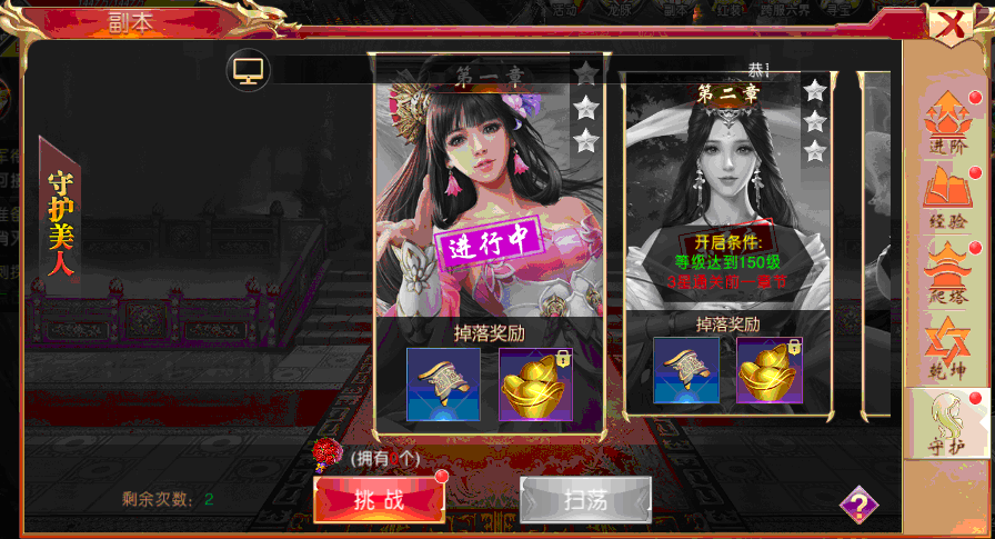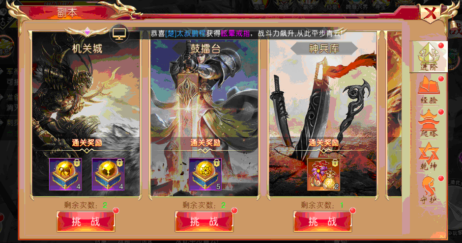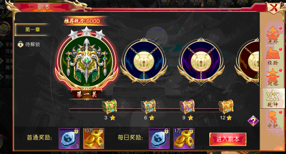 进阶副本每日限制挑战次数,挑战次数可获得重置,通关获取不同奖励。