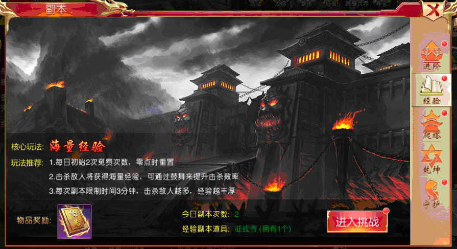 使用副本道具进入挑战可获得大量经验,每次初始两次免费次数,零点重置。