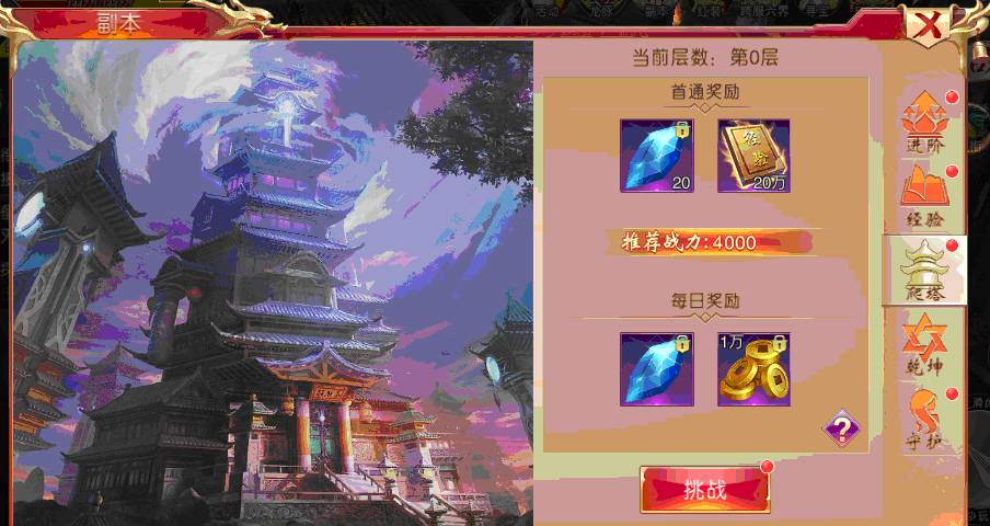可无限次数进入爬塔挑战副本,已通关层数不能再进入,每日0点根据前一天最高通关层数发放奖励。