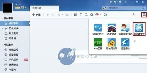 第一步、首先打开迅雷,然后点开“应用盒子”,选择“浏览器支持”插件。