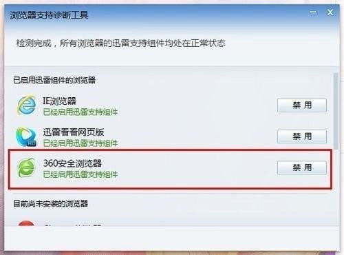 第二步、等待检测完成后,选择“启用”360安全浏览器的迅雷支持组件。