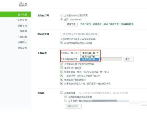 第三步、打开360安全浏览器,左上角工具=》选项=》基本设置=》使用迅雷下载。