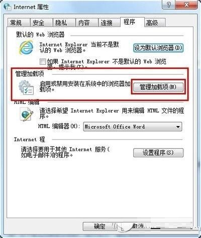 第四步、打开360安全浏览器=》菜单里=》工具=》Internet 选项=》程序=》管理加载项。