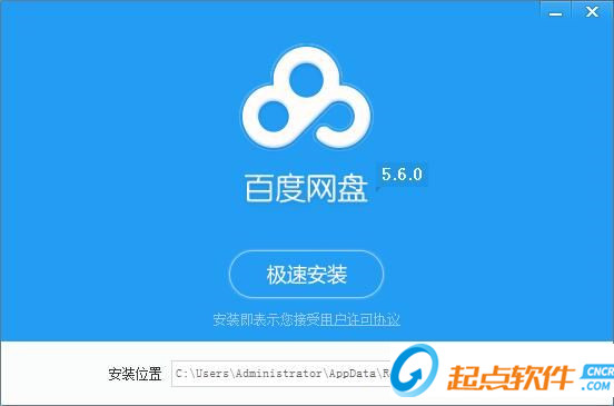 我们进入到百度网盘安装向导。百度网盘安装向导的主界面非常简洁,界面上只有百度网盘的标志和文字标题。安装程序为用户默认接受了用户使用协议,只需点击极速安装]就可以将百度网盘安装到电脑上;
