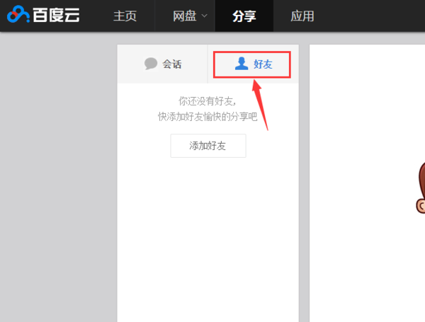 我们说的百度云网盘的好友,就在这里边,在下图的位置当中就可以看到好友的界面,接下来就可以添加自己的好友了。