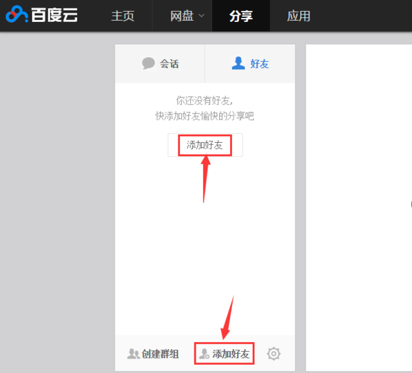 如果你还没有添加过百度云网盘好友的话,在好友框的位置,或者底部都有添加好友的选项,选择鼠标左键单击即可。