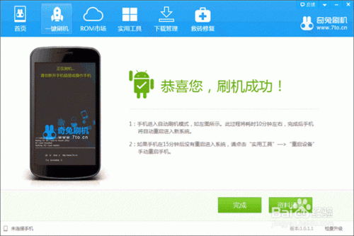 5、软件提示刷机成功手机重启,第一次开机比较慢,请耐心等待!