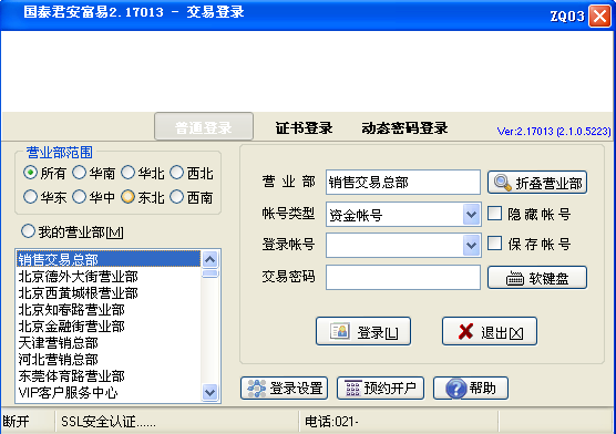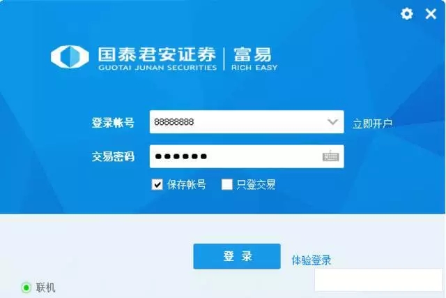 根据系统提示安装好国泰君安锐智版后,双击桌面国泰君安锐智版图标进入登入界面,登入帐号请使用开户时收到的资金账号,如果该资金帐号在公司系统内不同营业部之间有重号,会自动弹出营业部选择,请选择正确的开户营业部,然后输入开户设置密码登入。