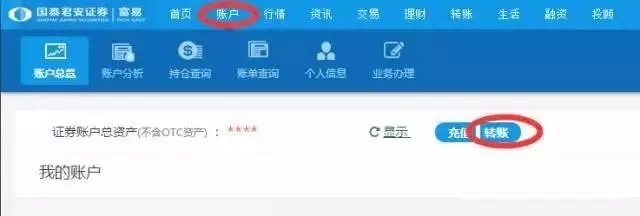 ①银证转账:首次交易的客户,在上方操作菜单点击账户,选择转账