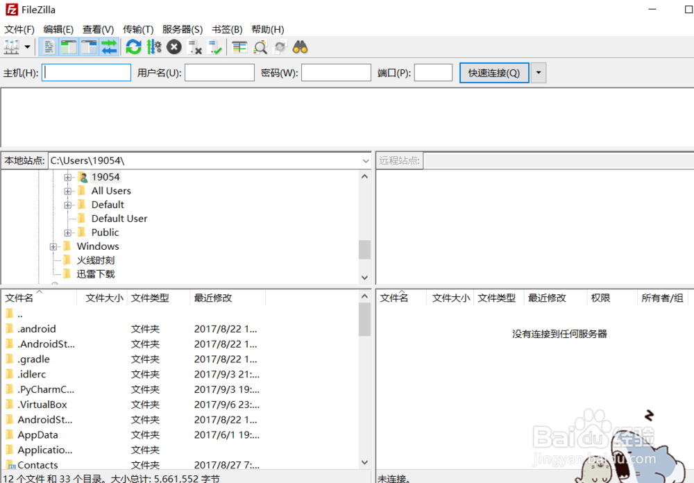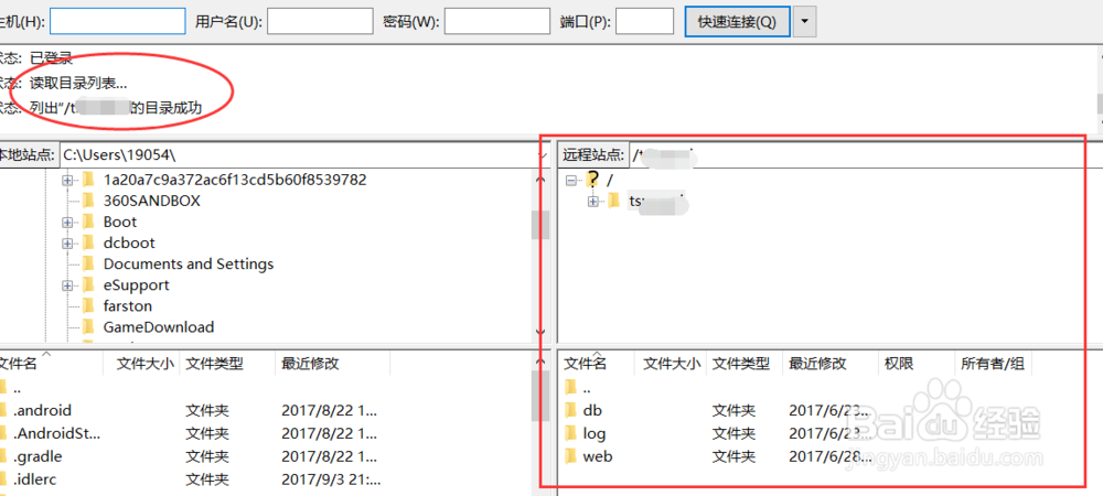 2、’进入后左边是本地目录和文件列表,右边为FTP的目录文件列表,你把FTP看作自己的U盘一样管理即可;