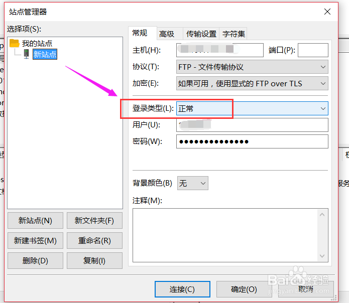 点击“新站点”,右边出现编辑区域,填写 主机IP,端口默认写21(FTP端口),登录类型选择“正常”,然后填写 你空间 FTP 用户名和密码。