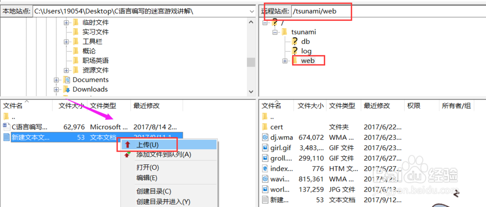 接着来上传文件,先双击菜单图标,进入网站的web目录下,我们一般把文件放在这里,接着我们在本地资源找到要上传的文件,单击右键,若单个的话,可以直接点击“上传”,或加入队列,多个上传。
