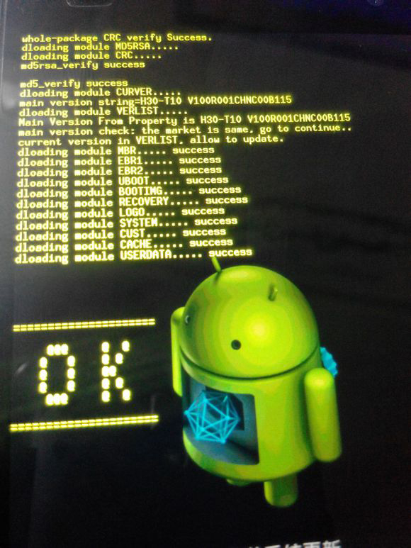 整个升级过程约三五分钟。不要做任何操作,耐心等待,升级界面出现OK字样后,代表已刷机成功,现在依旧不要动,升级完成后会自动重启,刷机后第一次开机过程会有点慢,耐心等待就是了。