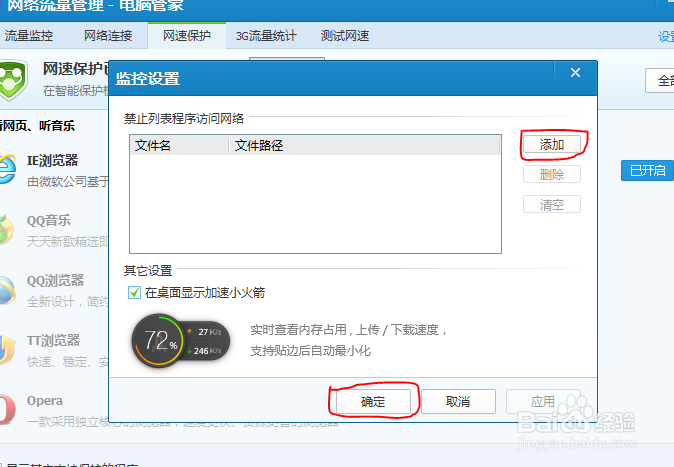 在点击”设置“按钮后弹出的对话框下,点击”添加“按钮,在弹出的对话框里选择想要禁用联网的程序,点击”打开“添加到禁用列表,点击”确定“完成操作。(如图所示)