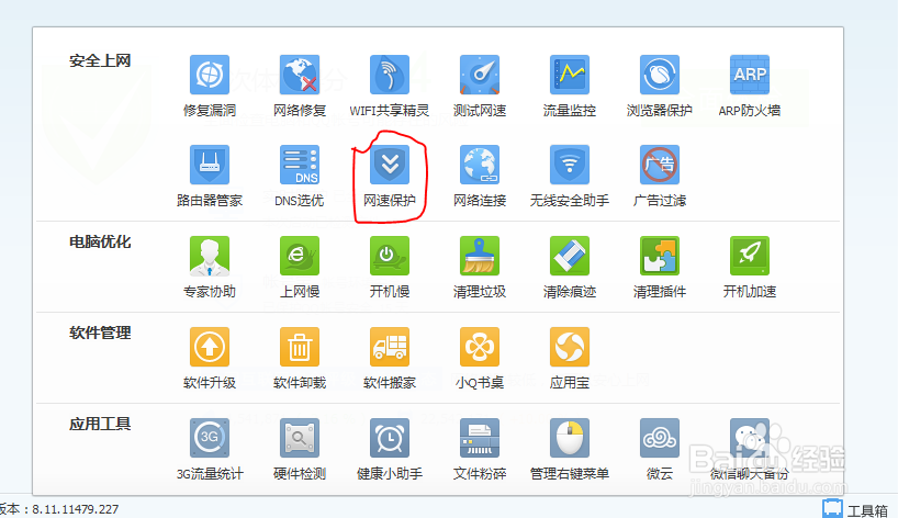 在“工具箱”界面下,点击“网速保护”选项。(如图所示)