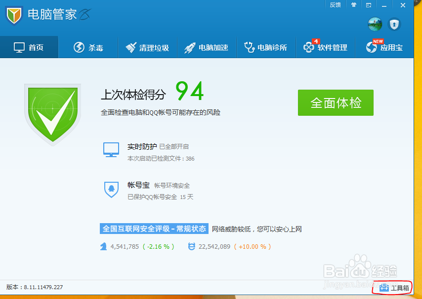 启动“腾讯电脑管家”,点击主界面右下角的“工具箱”(如图所示)