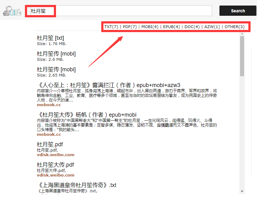 从图中可以看到 搜索 杜月笙 能找到 7本txt电子书资源,7 本pdf 电子书资源,还有4本mobi电子书资源,当然还有其他的。