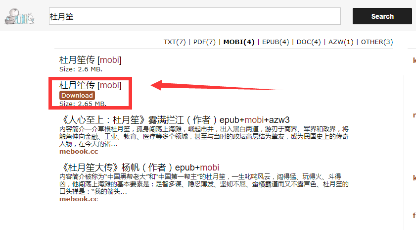 从图中你可以看到 有4本 杜月笙的mobi资源。点击第二个吧。你会看到下图,点击【Download】即完成。