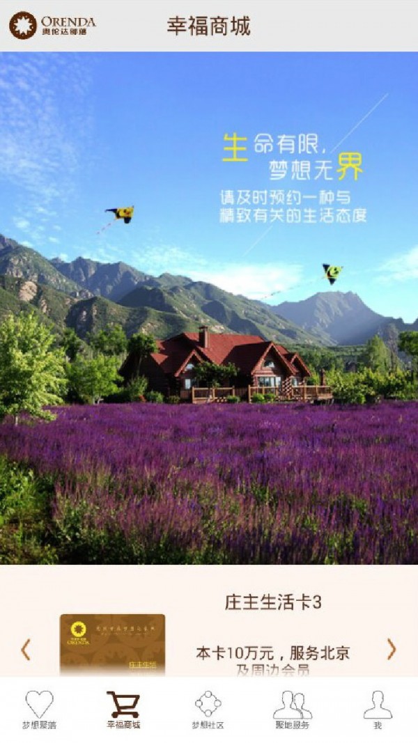 为全球精英人士提供一个会员专属的私享地。 在奥伦达部落运营的会员基地内,为全球尊贵会员提供私属农庄、家族酒庄、梦想街、五星级会员酒店、教堂、剧场、红酒会所、高尔夫球场、跑马场、有机餐饮、飞行小镇等全球顶级服务设施,并融合奥伦达部落独创TO(部落亲善大师)服务体系,为社会财智人群打造实践幸福梦想的聚地。