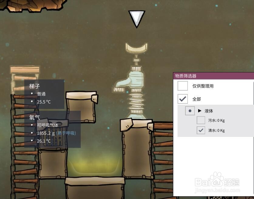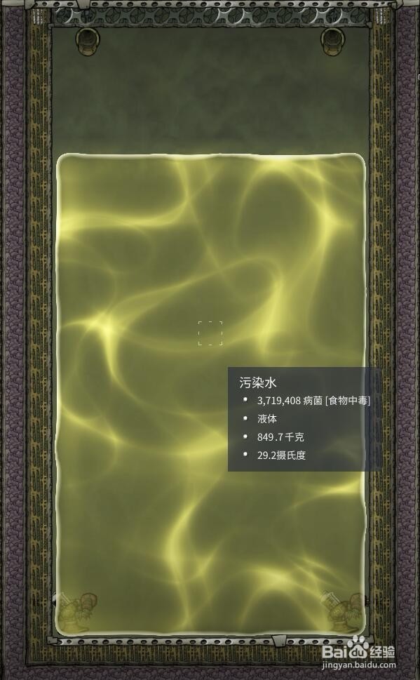 此时,应当把游戏速度调为慢速。等待复制人运送来污水,当污水铺满下面两块砖的表面时(大概如图所示),在游戏暂停的状态下点击取消液体排放,此时排水动作就会立刻停止。当然,网上有那种用抽水机和液体阀门控制流量的,我看完全没有必要。那么,用瓶装水排空机怎么控制水量呢?有两个诀窍:游戏慢速和空格键暂停游戏。当瓶装水排空机滴出水来时,可以快速不断的按空格键暂停观看,如果污水达到要求,在游戏暂停的状态下点击取消液体排放,此时排水动作就会立刻停止。