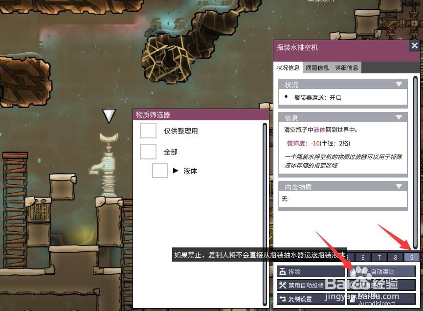 然后,把瓶装水排空机设置优先级为9,并且启用自动灌注,这样的话复制人就会自动从瓶装抽水器里面抽水到这来来排空。设置优先级为9是为了让复制人优先做排水工作,当然你也可以把其他工作暂时取消,让复制人专心的做高压制氧