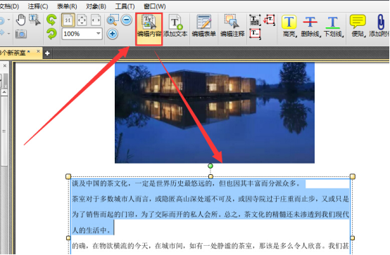 3.点击“编辑内容”按钮,我们可以发现文件上的文字、图片等元素将会备份编辑框包围,鼠标点击编辑框中的内容即可随意编辑。