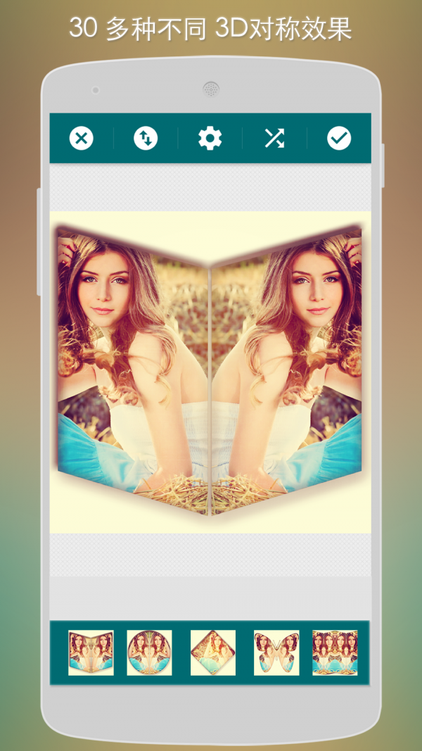 *)选择本地或者通过相机拍摄来创建镜面图片;*)左右,上下对称,4片,6片,9片图片重复等共近20种镜面效果;