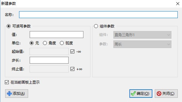 (3)参数。它是一个变量,含有名称、值、单位、起始值、步长、终止值这几个重要属性。参数分为只读参数和可读写参数,其中,只读参数是一个图形的属性生成的,例如线段的长度、圆的半径、双曲线的离心率等等,它只能在图形发生变化时被动地改变,用户不能主动地修改它的值;可读写参数是由用户手动添加的一个参数,可以主动修改。参数可以用在任何支持含参的表达式中并参与计算。例如,假设一个点的坐标中含有一个参数P,当P的值发生变化时,点也将会发生移动。