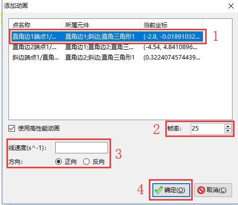 ②在弹出的窗口中选择要运动的点,并设置动画的帧率、运动的线速度和方向,单击“确定”按钮添加