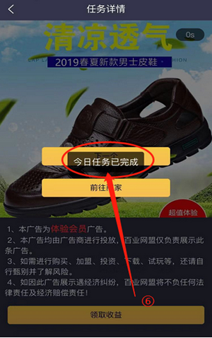 2、浏览广告(免费会员可以浏览5条广告,每条1元)直至第六步显示“今日任务已完成”当日的广告任务就算完成了!