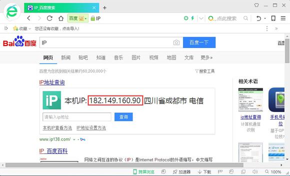 为了确认重启光猫是否可以获得新的外网IP,可以在重启光猫之前先在百度中查询当前的外网IP,如下图所示。